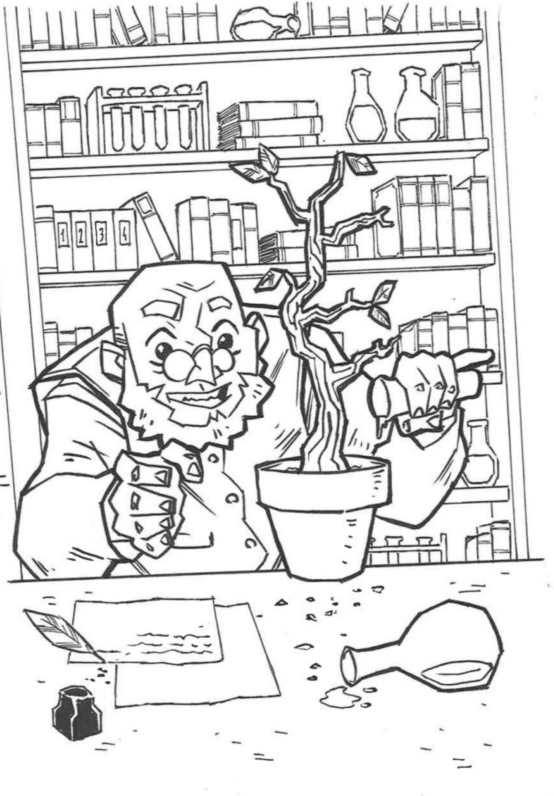 Lo Speziale (3° taccuino). Il vecchio erborista di Crowly, la città dove vivono i nostri eroi. Anziano, pochi capelli, un po’ curvo e di bassa statura che procede sempre piuttosto lentamente.