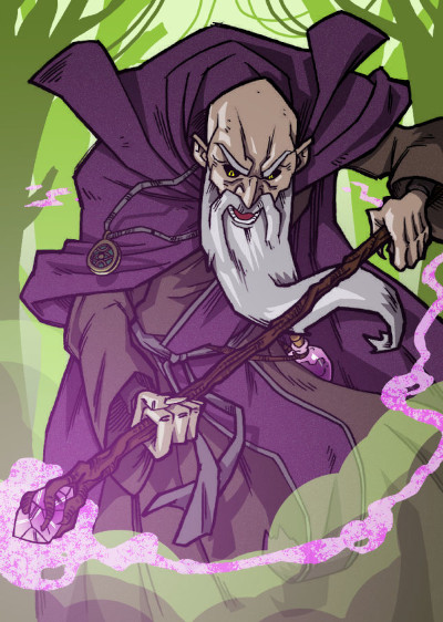 Il nemico per eccellenza, il suo alter ego stregonesco. Negromante potentissimo con capacità magiche incredibili. Alto, età indefinibile, potrebbe avere 1.000 anni, pelato completamente, occhi nerissimi, folta barba biancastra striata di inquietanti venature di pelo nero. Rugoso, naso adunco, magrissimo, ha uno sguardo che incute terrore in chiunque, sempre con vesti stile mantelli con cappuccio che nascondono tutto il corpo lasciando solo le mani scheletriche fuori.